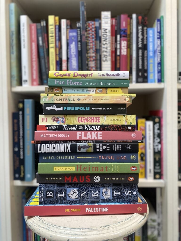 Today we’re highlighting some of our Team’s favourite graphic novels! Ranging from children’s to teen to adult, covering both fiction and non-fiction, these graphic novels run from memoirs to magical adventures, political history to spine-tingling horror, featuring cowgirls, investigative cats, and many (many!) talking creatures.